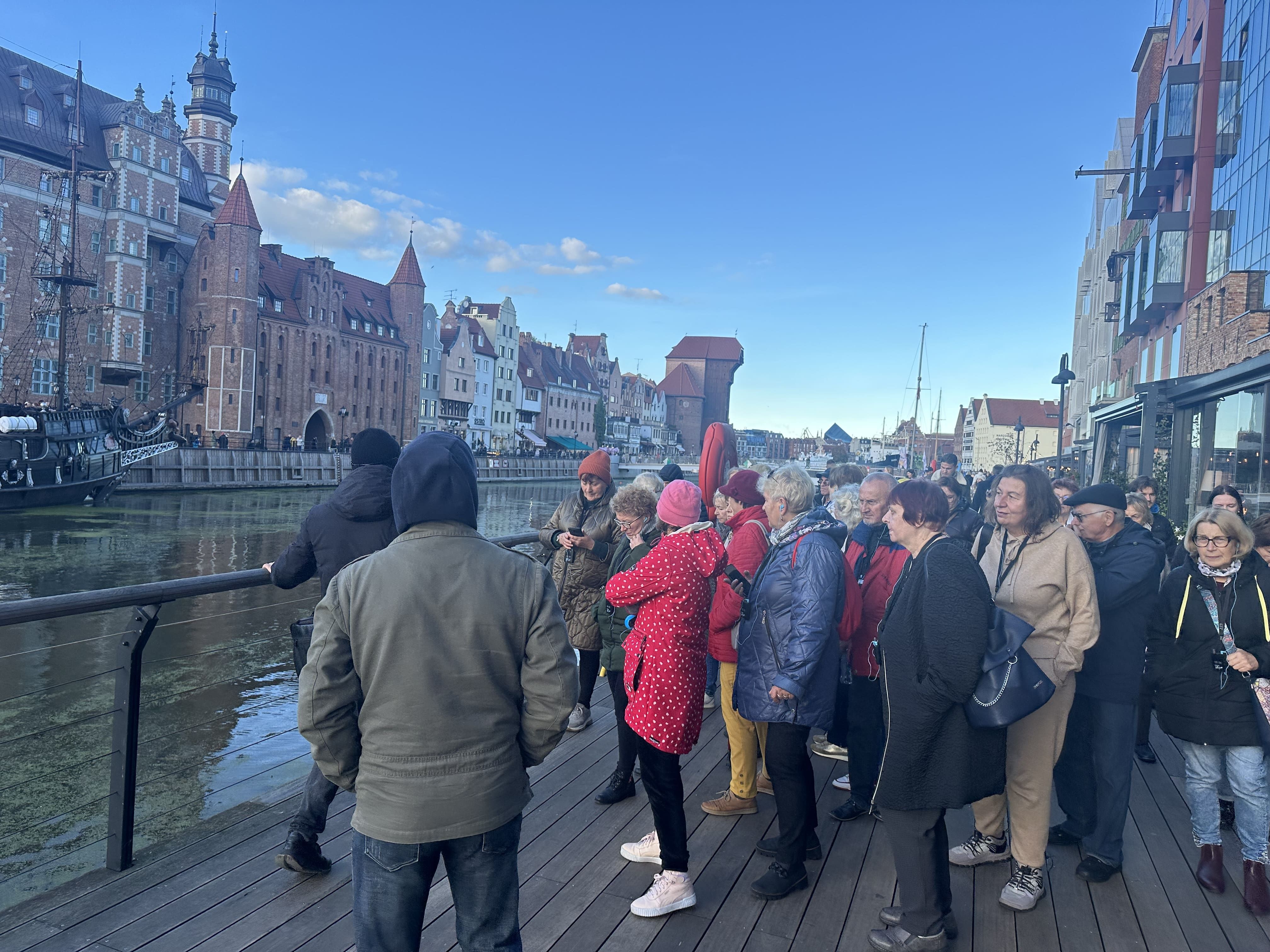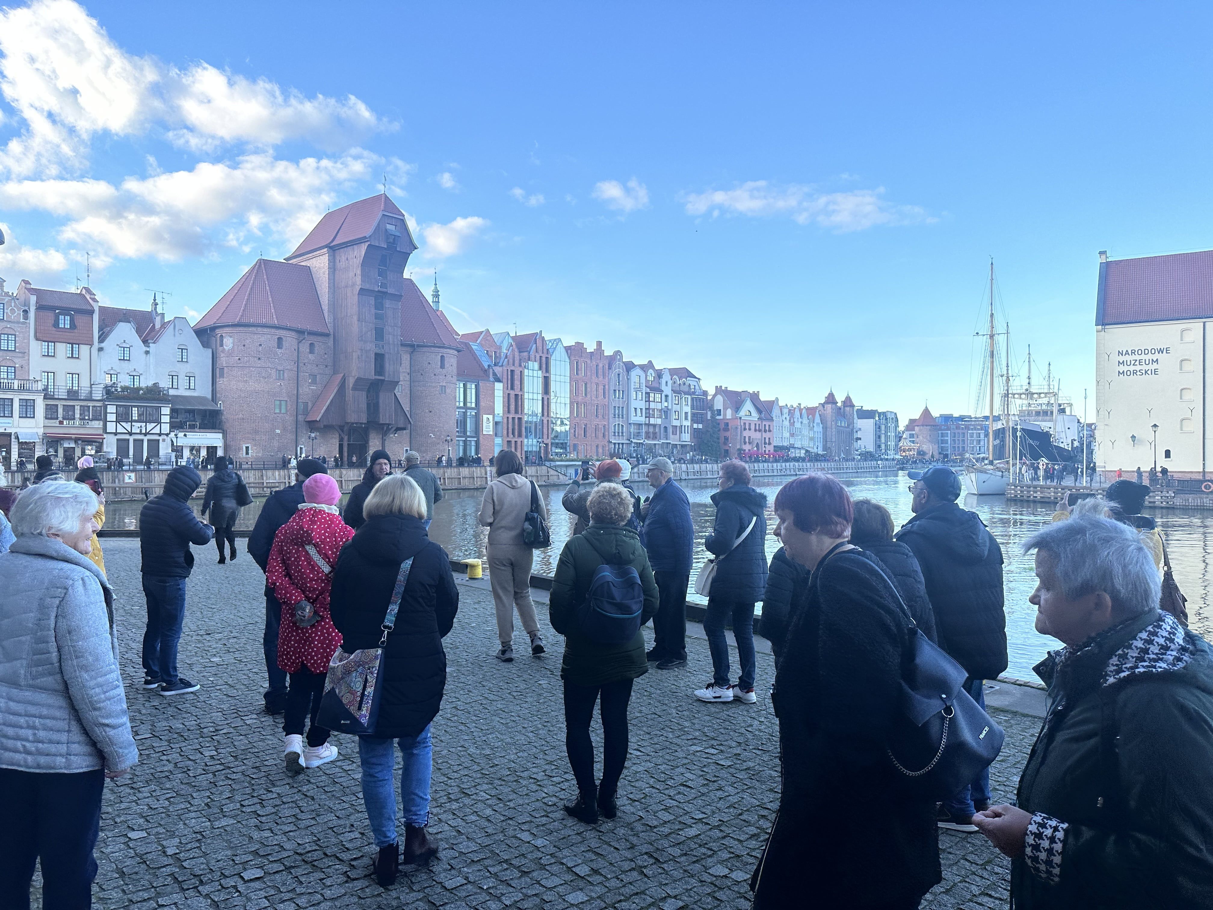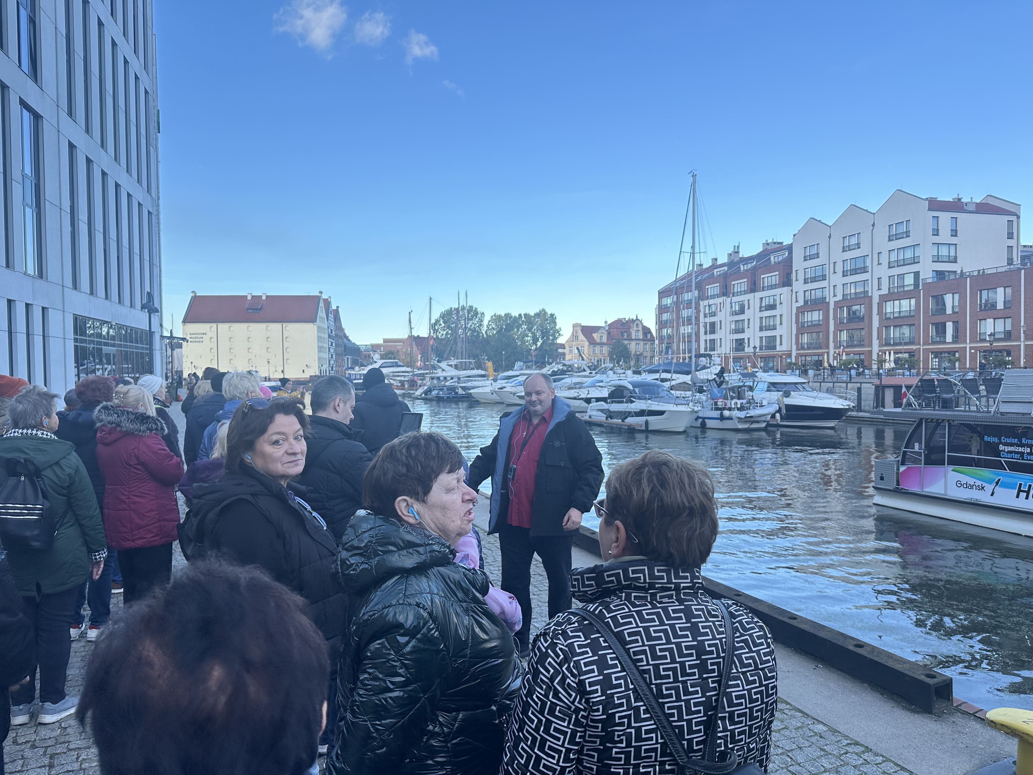 W trzecim dniu pielgrzymki spacerowaliśmy razem z przewodnikiem p. Arkiem po starówce gdańskiej. Spacer rozpoczęliśmy od Wyspy Spichrzów. Jeszcze 20 lat temu ta część Gdańska była zaniedbana, a kto się tam zapuszczał, mógł oberwać po głowie lub narazić się na opróżnienie zawartości kieszeni lub torebki. Spacer tylko na własną odpowiedzialność.