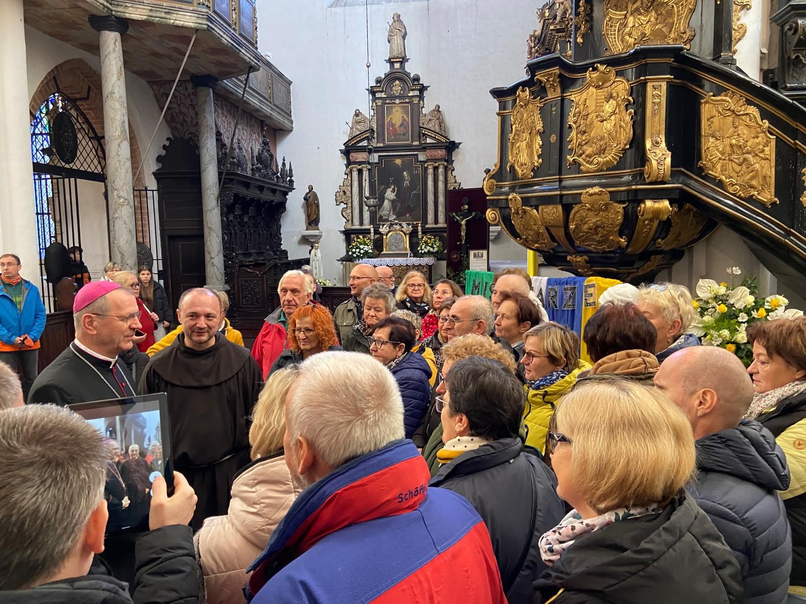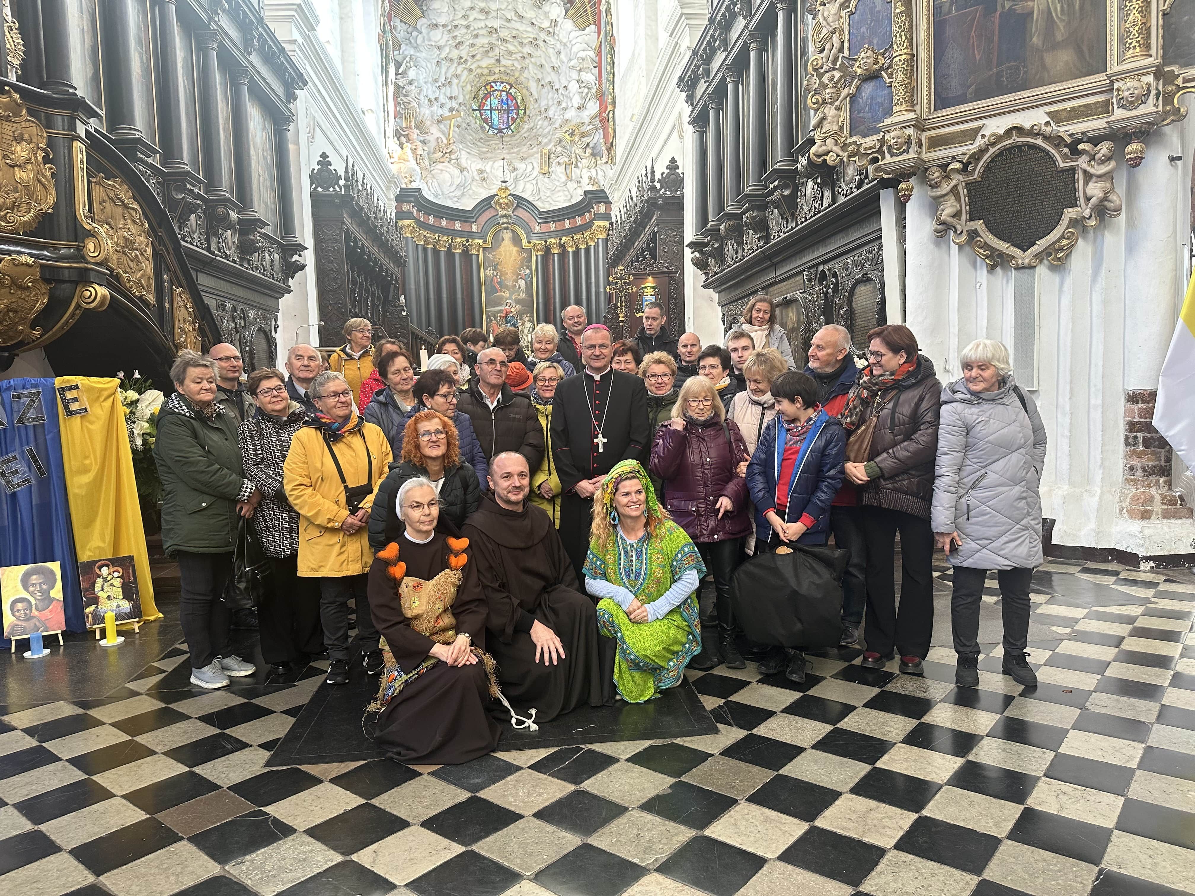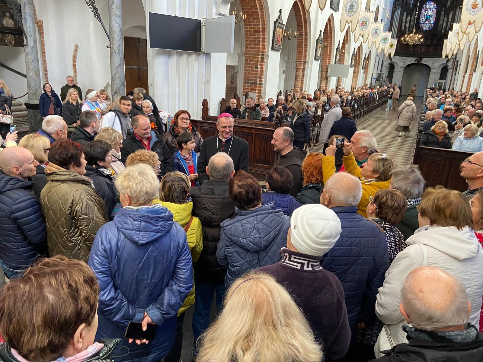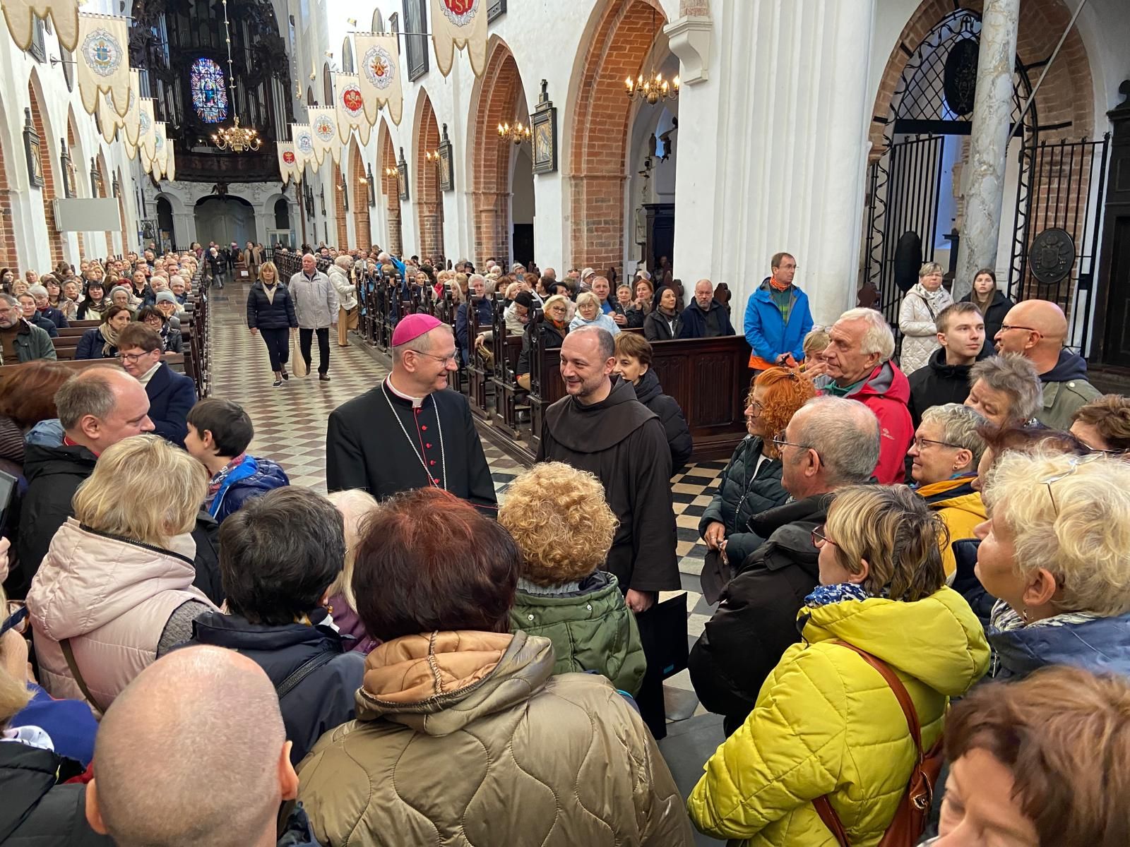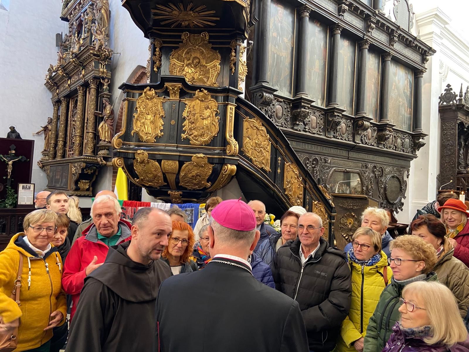 • Katedrę w Gdańsku – Oliwie. Uczestniczyliśmy we Mszy św. o godz. 10.00. W ramach Roku Świętego obchodzono w tym dniu Jubileusz Świata Misyjnego. Mszy przewodniczył ks. abp. Tadeusz Wojda. Przed Mszą spotkaliśmy znajomą Ojca Serafina, siostrę Miriam ze Zgromadzenia Sióstr Serafitek, która razem z o. Proboszczem pielgrzymowała z Rybnika kilka razy pieszo na Jasną Górę. Co za spotkanie! Pod koniec Mszy św. Siostra pozdrowiła nas serdecznie. A po mszy poprosiła ks. abp. Tadeusza Wojdę, Przewodniczącego Konferencji Episkopatu Polski o wspólne zdjęcie. Ks. abp porozmawiał z nami chwilę. Był uradowany, kiedy dowiedział się, że nasza Archidiecezja Katowicka obchodzi 100-lecie, podobnie jak Archidiecezja Gdańska. Podczas Mszy mieliśmy okazję posłuchać brzmienia słynnych organów.
