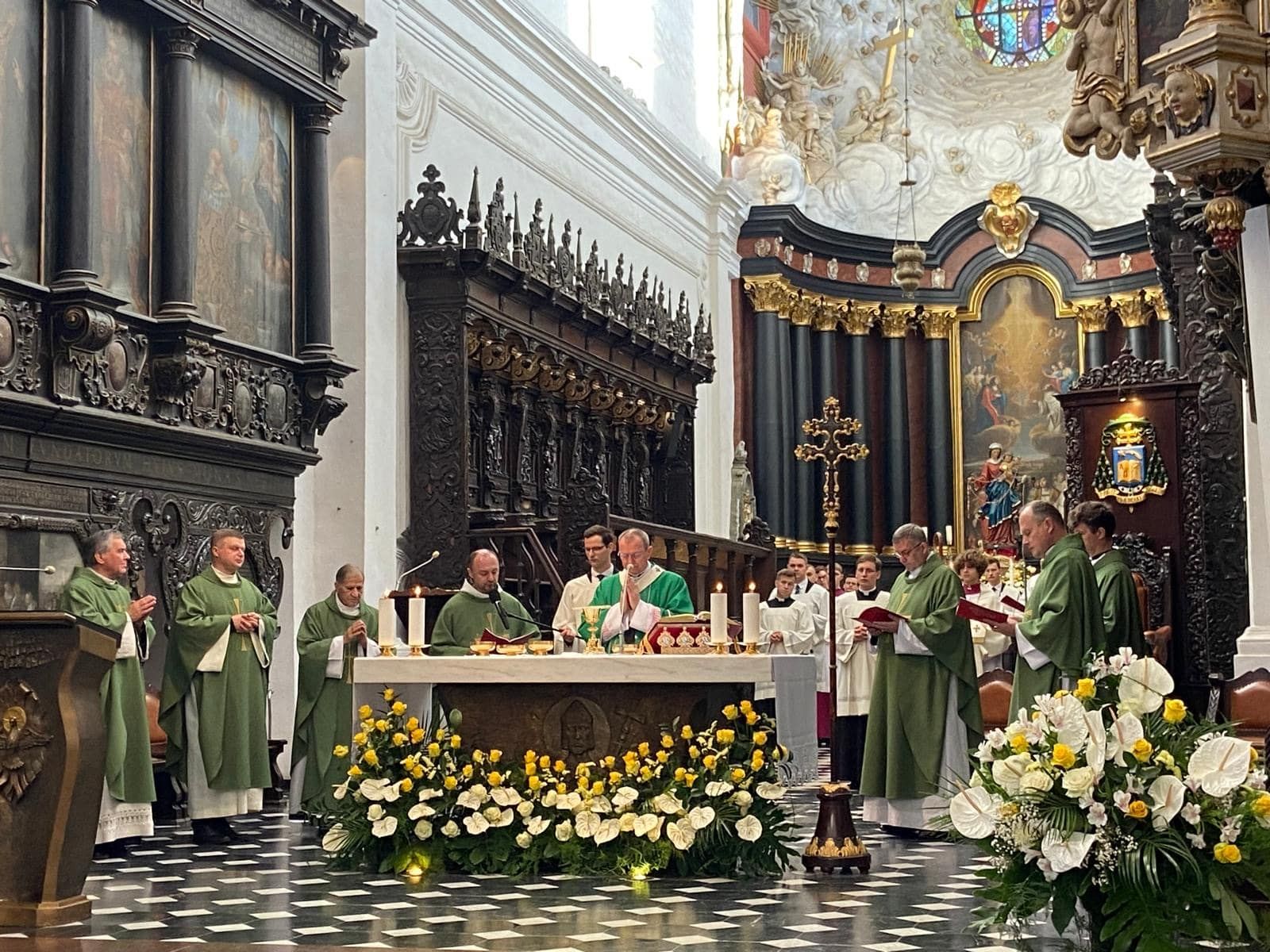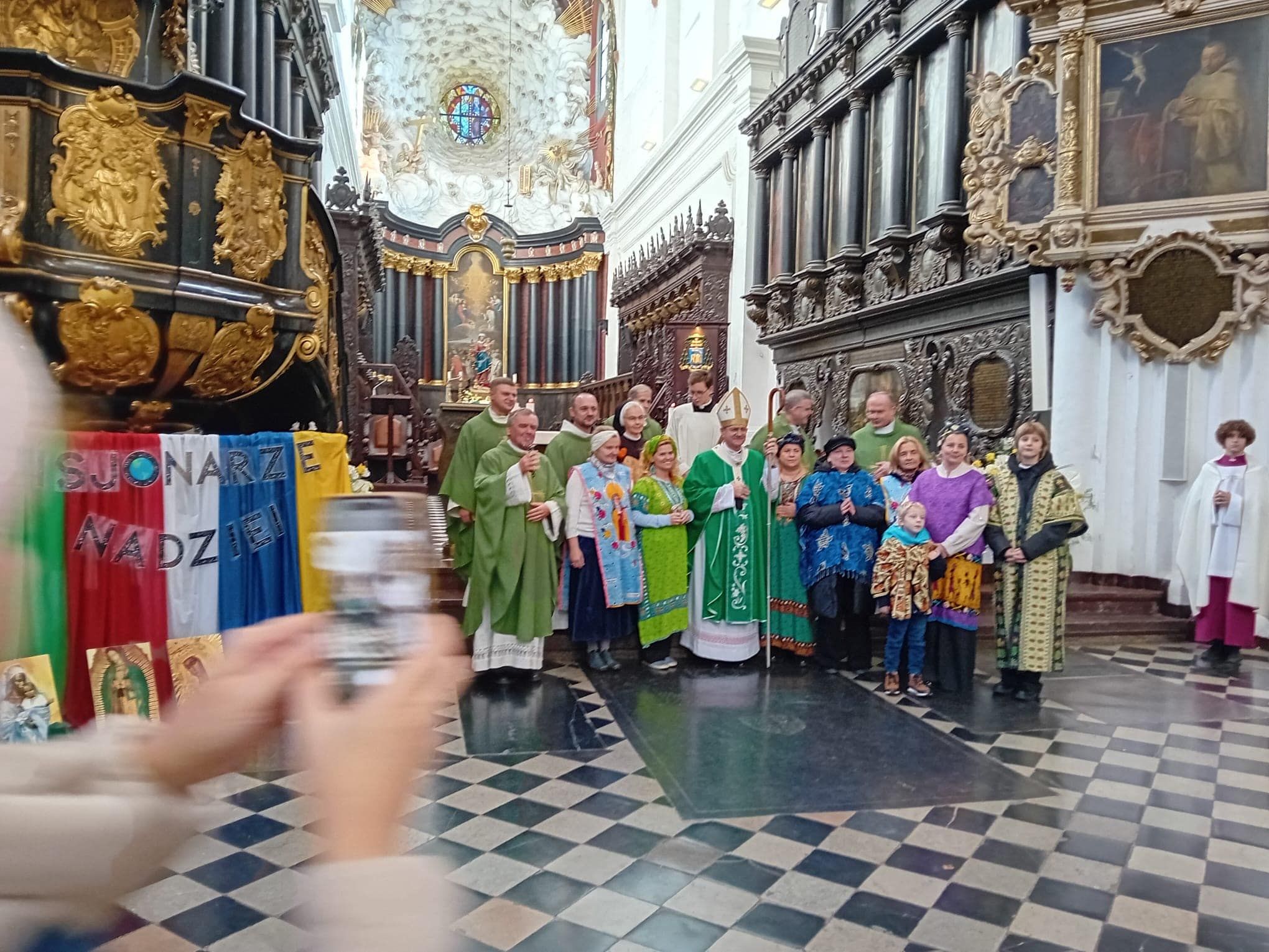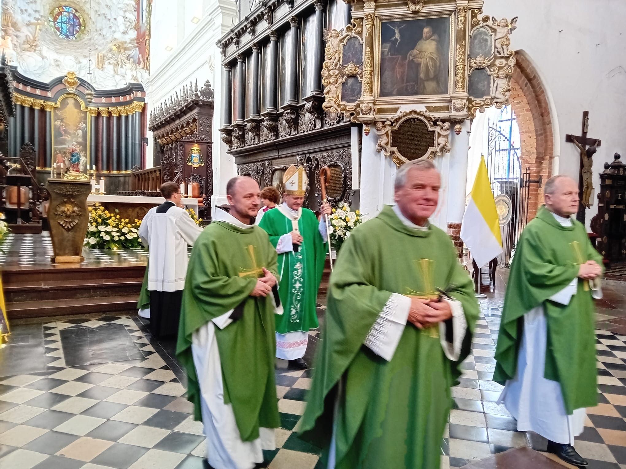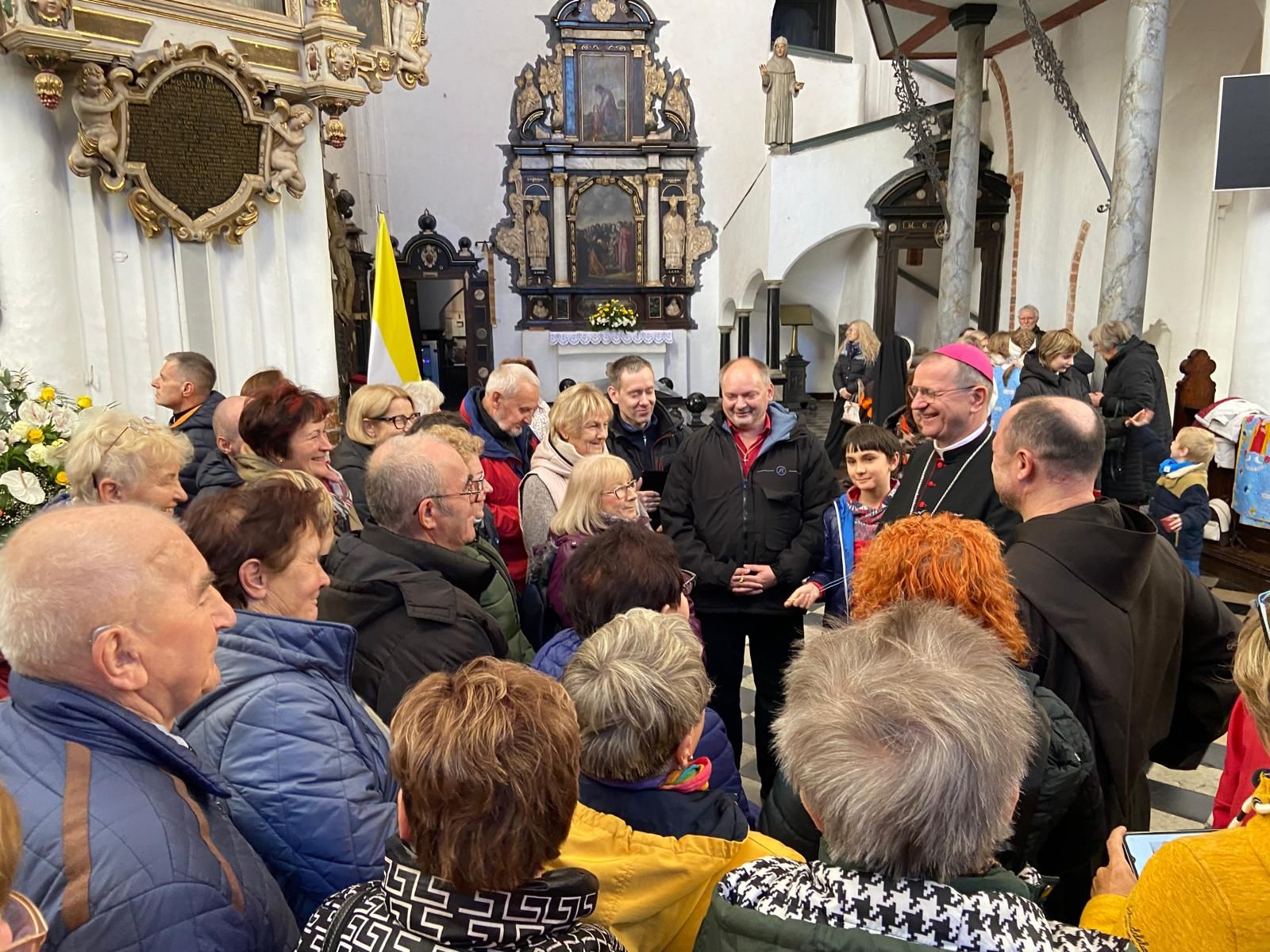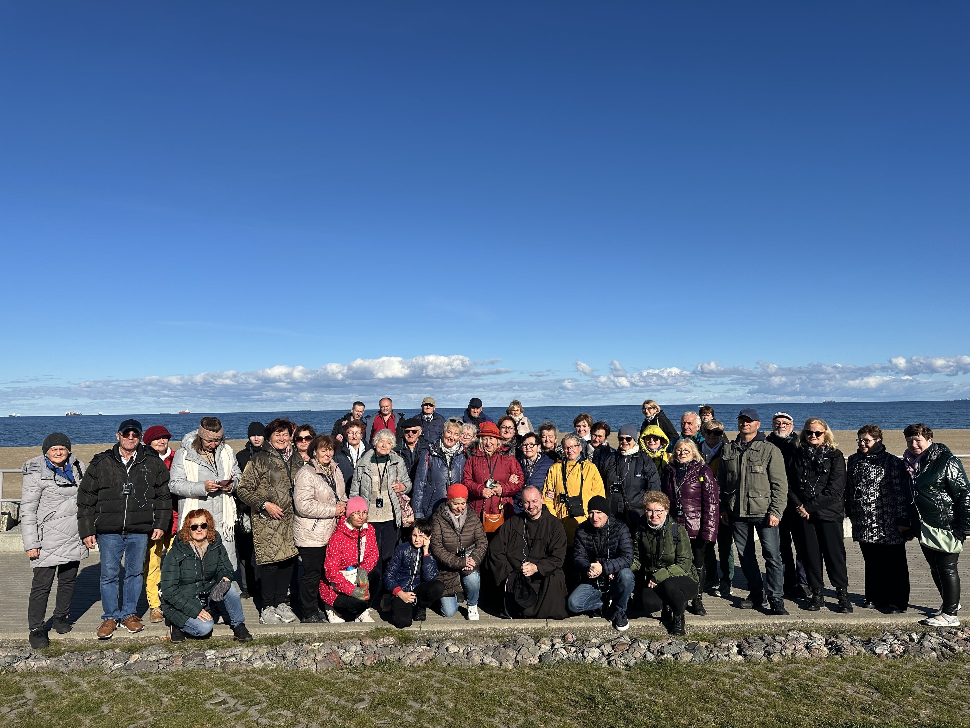 • Katedrę w Gdańsku – Oliwie. Uczestniczyliśmy we Mszy św. o godz. 10.00. W ramach Roku Świętego obchodzono w tym dniu Jubileusz Świata Misyjnego. Mszy przewodniczył ks. abp. Tadeusz Wojda. Przed Mszą spotkaliśmy znajomą Ojca Serafina, siostrę Miriam ze Zgromadzenia Sióstr Serafitek, która razem z o. Proboszczem pielgrzymowała z Rybnika kilka razy pieszo na Jasną Górę. Co za spotkanie! Pod koniec Mszy św. Siostra pozdrowiła nas serdecznie. A po mszy poprosiła ks. abp. Tadeusza Wojdę, Przewodniczącego Konferencji Episkopatu Polski o wspólne zdjęcie. Ks. abp porozmawiał z nami chwilę. Był uradowany, kiedy dowiedział się, że nasza Archidiecezja Katowicka obchodzi 100-lecie, podobnie jak Archidiecezja Gdańska. Podczas Mszy mieliśmy okazję posłuchać brzmienia słynnych organów.