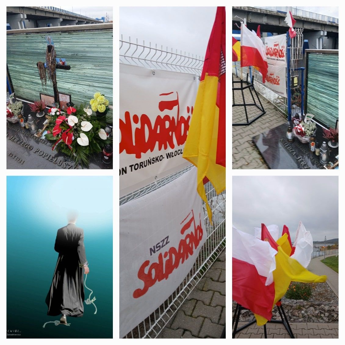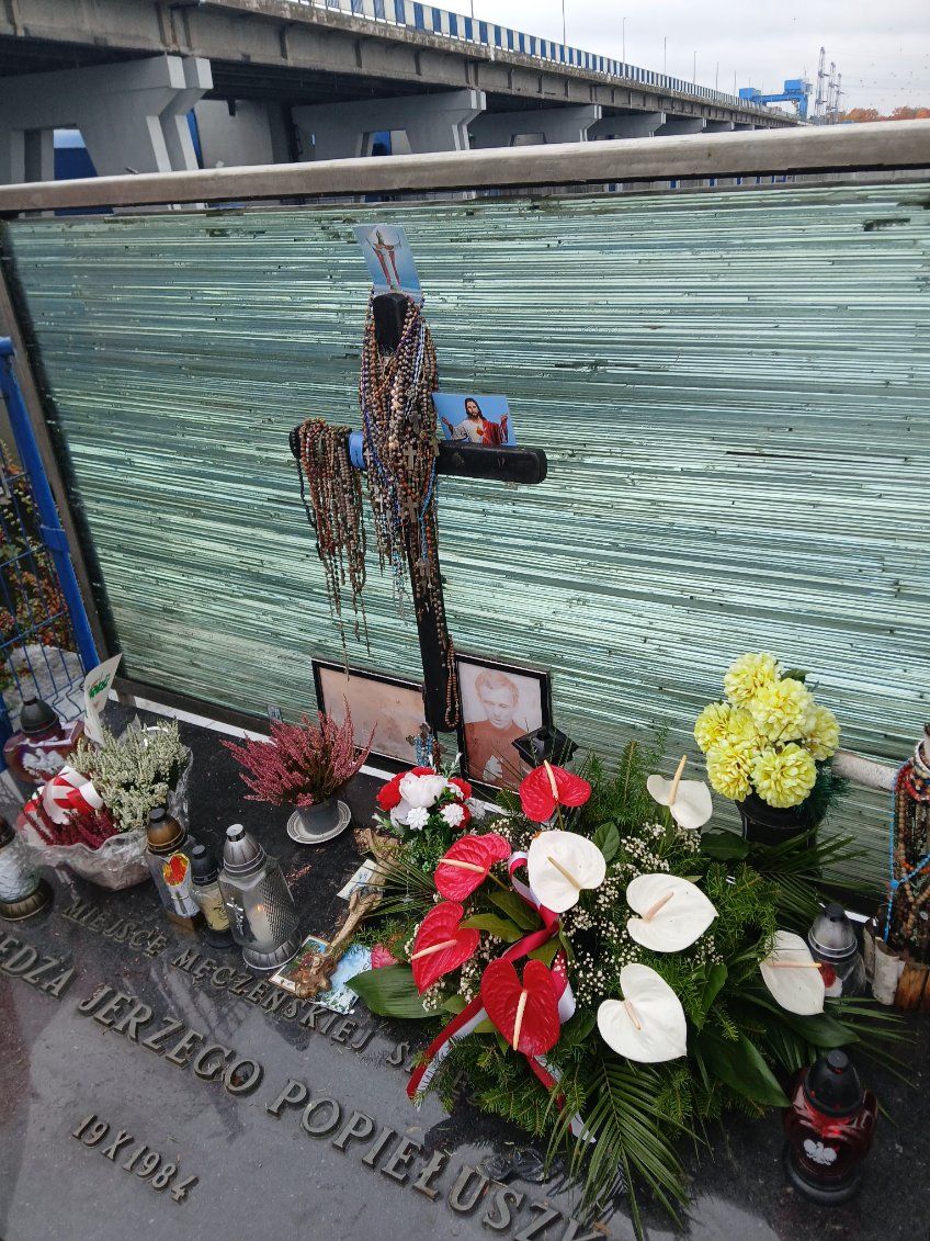 Pierwszym miejscem, które odwiedziliśmy była tama we Włocławku, gdzie ks. Jerzy został zamordowany. Tragedię tę upamiętnia płyta z napisem „Miejsce męczeńskiej śmierci ks. Jerzego Popiełuszki 19.10.1984 r.” Na płycie znajduje się krzyż z zawieszonymi różańcami, zdjęcie ks. Jerzego, kwiaty, znicze, flagi Polski, banery Solidarności. Po krótkiej modlitwie podeszliśmy do oddalonego kilkadziesiąt metrów Krzyża Pomnika, upamiętniającego śmierć ks. Jerzego. Krzyż został poświęcony przez Papieża Jana Pawła II podczas pielgrzymki do Polski 7.06.1991 r. W kolejną rocznicę uprowadzenia Księdza, 19 października 1991 r. krzyż ten został odsłonięty i pobłogosławiony przez Prymasa Józefa Glempa.