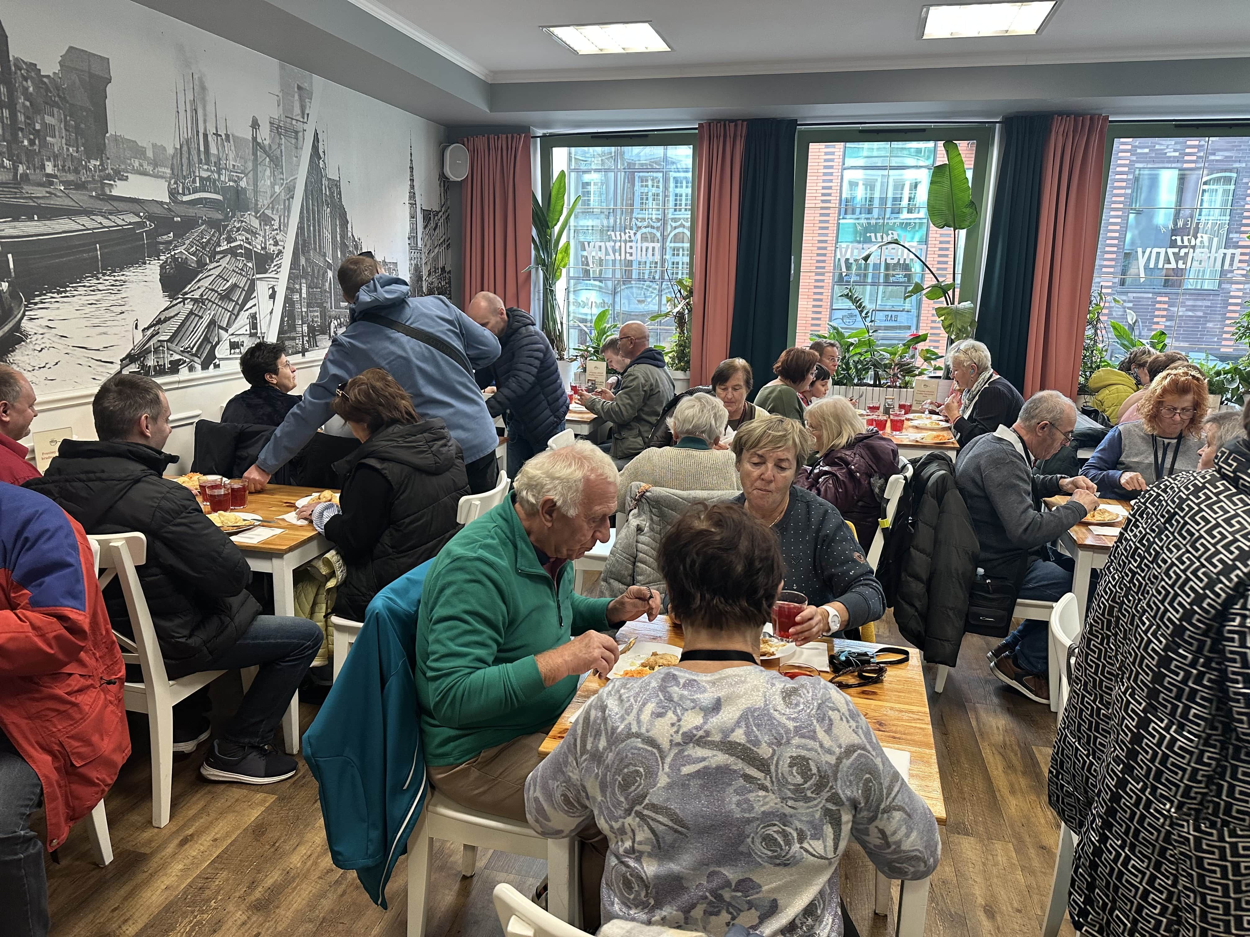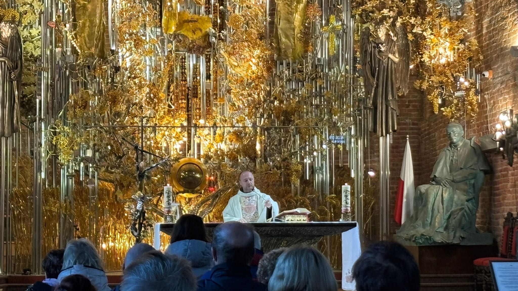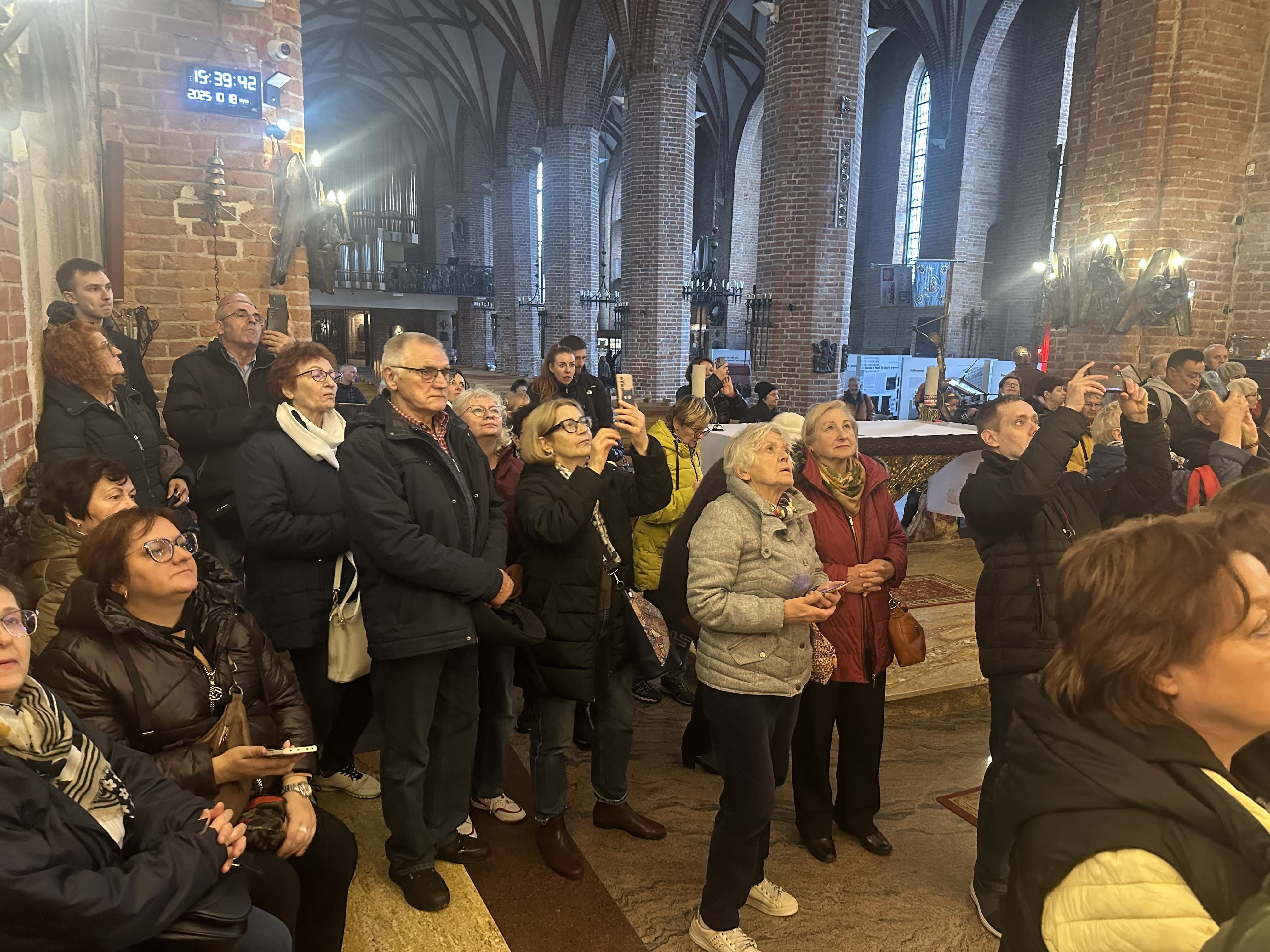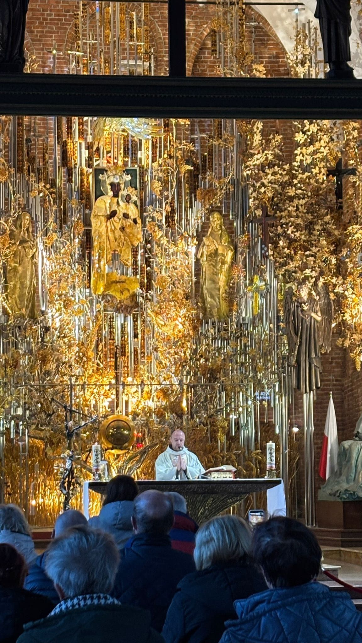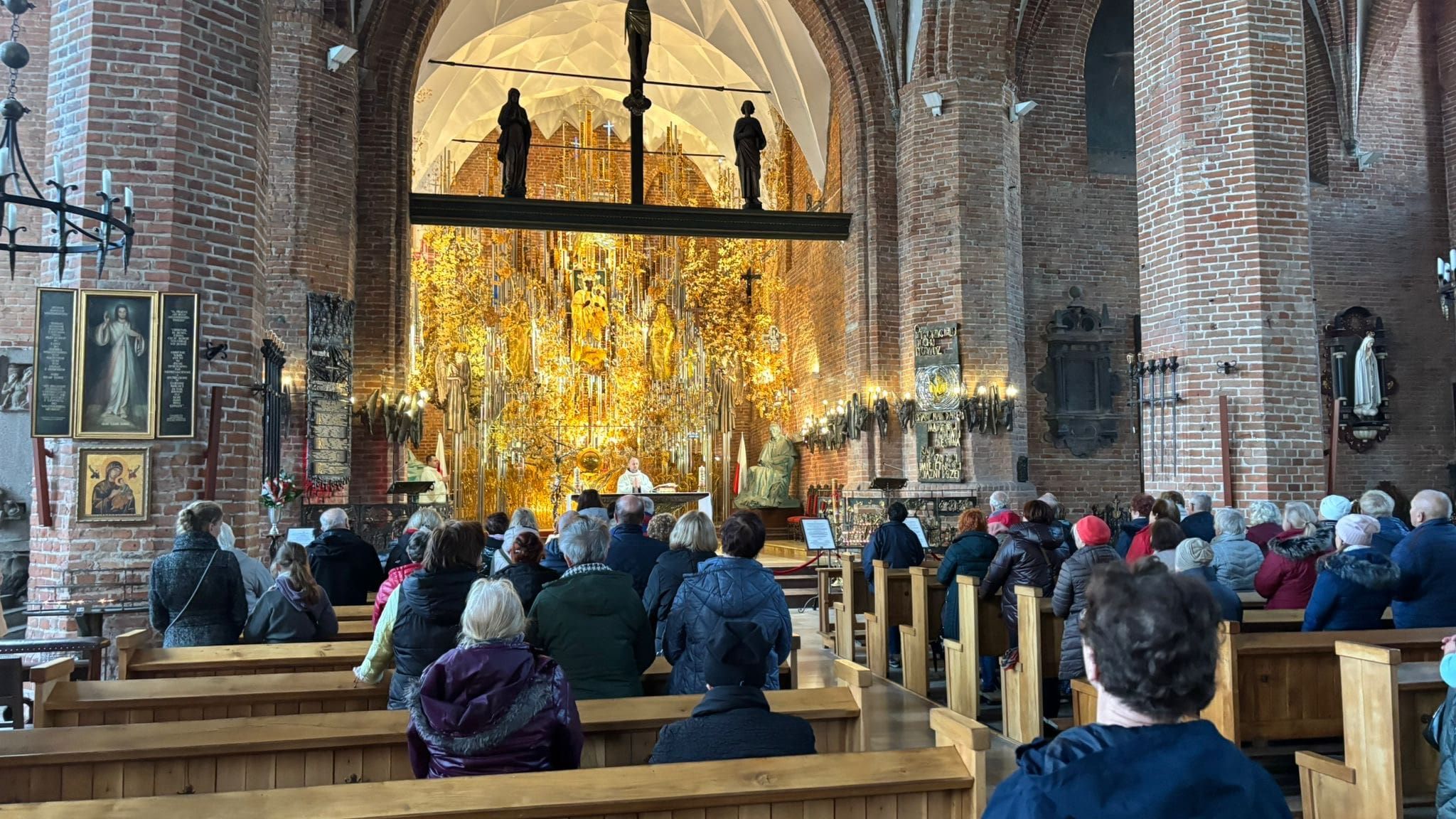 • Bazylikę św. Brygidy, gdzie ks. Dziekan opowiadał nam o słynnym bursztynowym ołtarzu. W centrum ołtarza jest tabernakulum, nad którym znajduje się obraz MB Częstochowskiej w sukience z białego bursztynu. W ołtarzu - srebrne i pozłacane latorośle z winnego krzewu z bursztynowymi gronami i krzyże z relikwiami bł. ks. Jerzego Popiełuszki oraz św. Jana Pawła II. Ołtarz jest wciąż rozbudowywany. W czasie pandemii dodano złote kłosy. Umieszczono też krzyże upamiętniające wydarzenia z dziejów Polski, w tym: Krzyż Pomnika Ofiar Czerwca 1956 r., Pomnika Poległych Stoczniowców w 1970 r. oraz replika krzyża przy KWK Wujek upamiętniająca Dziewięciu z Wujka. Są też krzyże z Katynia i Miednoje. Najstarszą częścią Bazyliki jest Kaplica Chrztu, a pod odkryta w 2016 r. Kaplica Czaszek (około 500 czaszek sióstr brygidek). Znajduje się tam również srebrny relikwiarz ufundowany z okazji 1000-lecia miasta Gdańska. W centralnym miejscu jest widoczna relikwia (żuchwa) św. Brygidy, w ramionach krzyża relikwie św. Piotra i Pawła oraz Krzyża Świętego, a także św. Wojciecha, Stanisława Kostki i 20 innych świętych i błogosławionych .