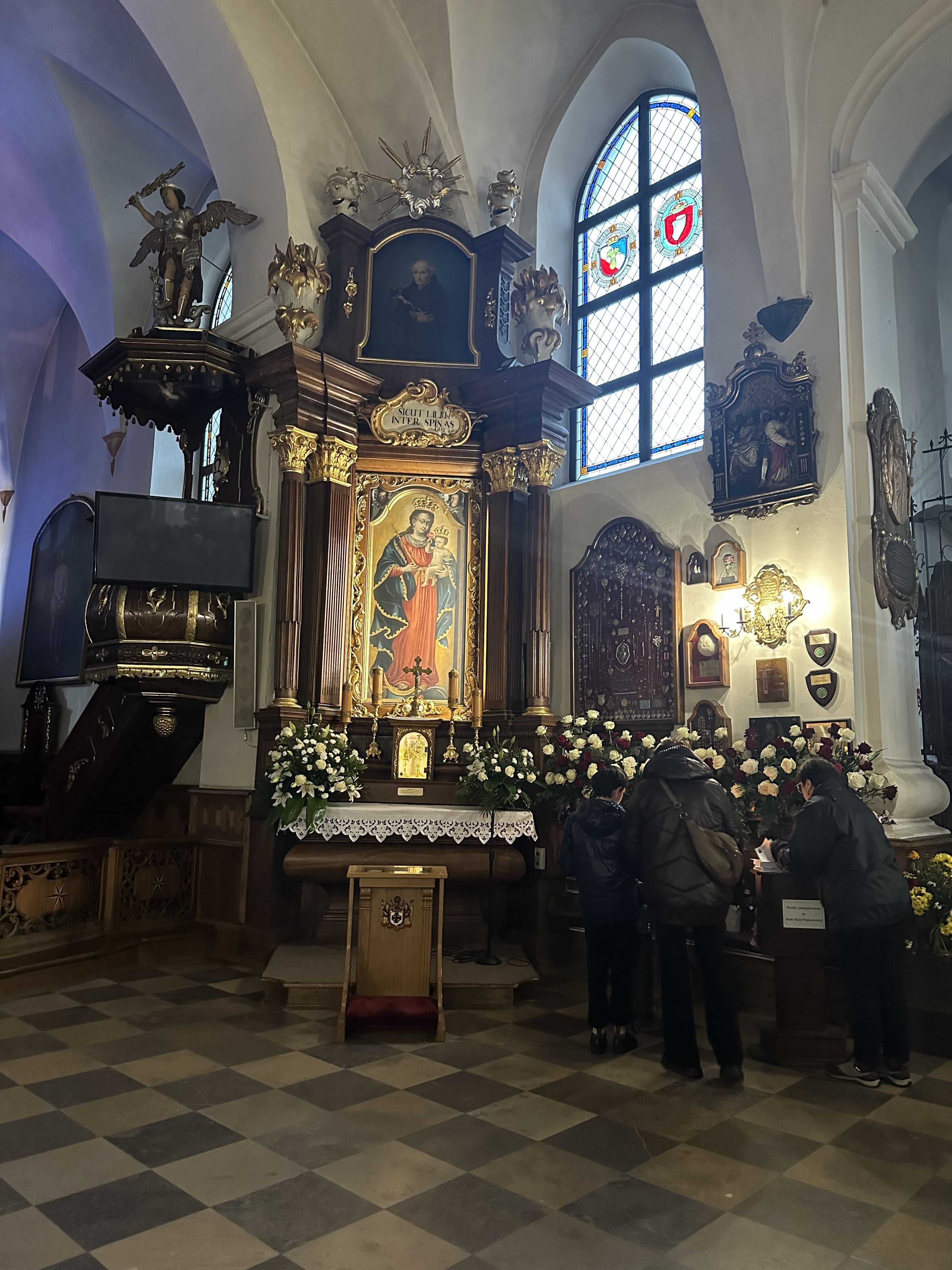 • Sanktuarium Matki Bożej Podgórskiej w Toruniu. Sanktuarium opiekują się Franciszkanie. Przywitał nas tam o. Kacper Grys OFM. Obraz Matki Bożej znajduje się w bocznej kaplicy. MB jest łagodnie uśmiechnięta i pokazuje światu Dzieciątko Jezus. Jej głowę otacza „wieniec z gwiazd dwunastu”, zaś u dołu widać księżyc i węża symbolizującego szatana. Do MB Podgórskiej wierni modlą się o umocnienie wiary i miłości w rodzinach oraz o dar potomstwa. Zatopiliśmy się tam w krótkiej modlitwie.