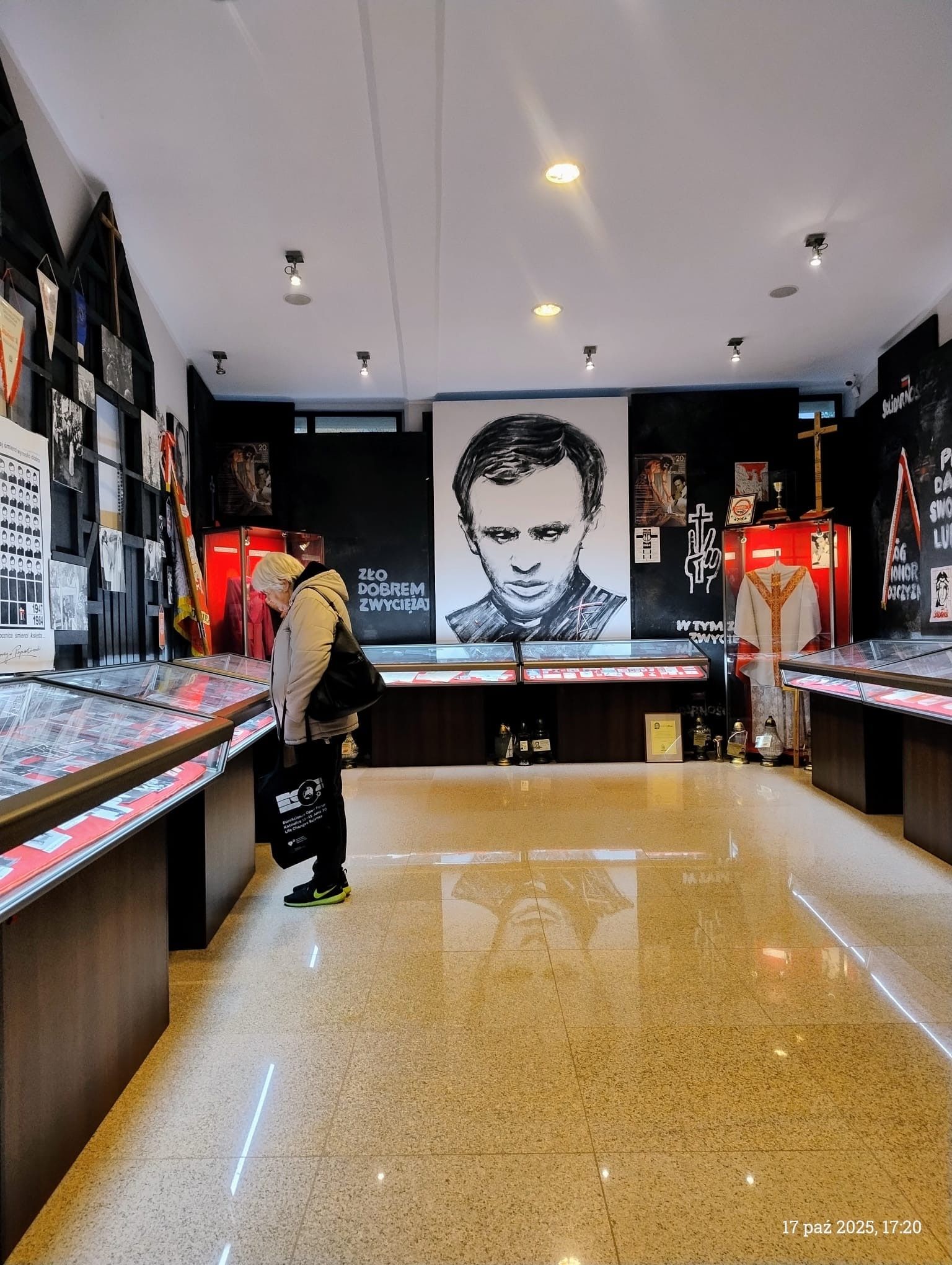 Odwiedziliśmy też kaplicę bł. ks. Jerzego. W gablotach umieszczono wiele fotografii z Jego życia (m.in. z ostatniej Mszy św.), z czasów stanu wojennego, artykuły prasowe dotyczące uprowadzenia i zabójstwa Księdza, a także szaty liturgiczne, których używał.