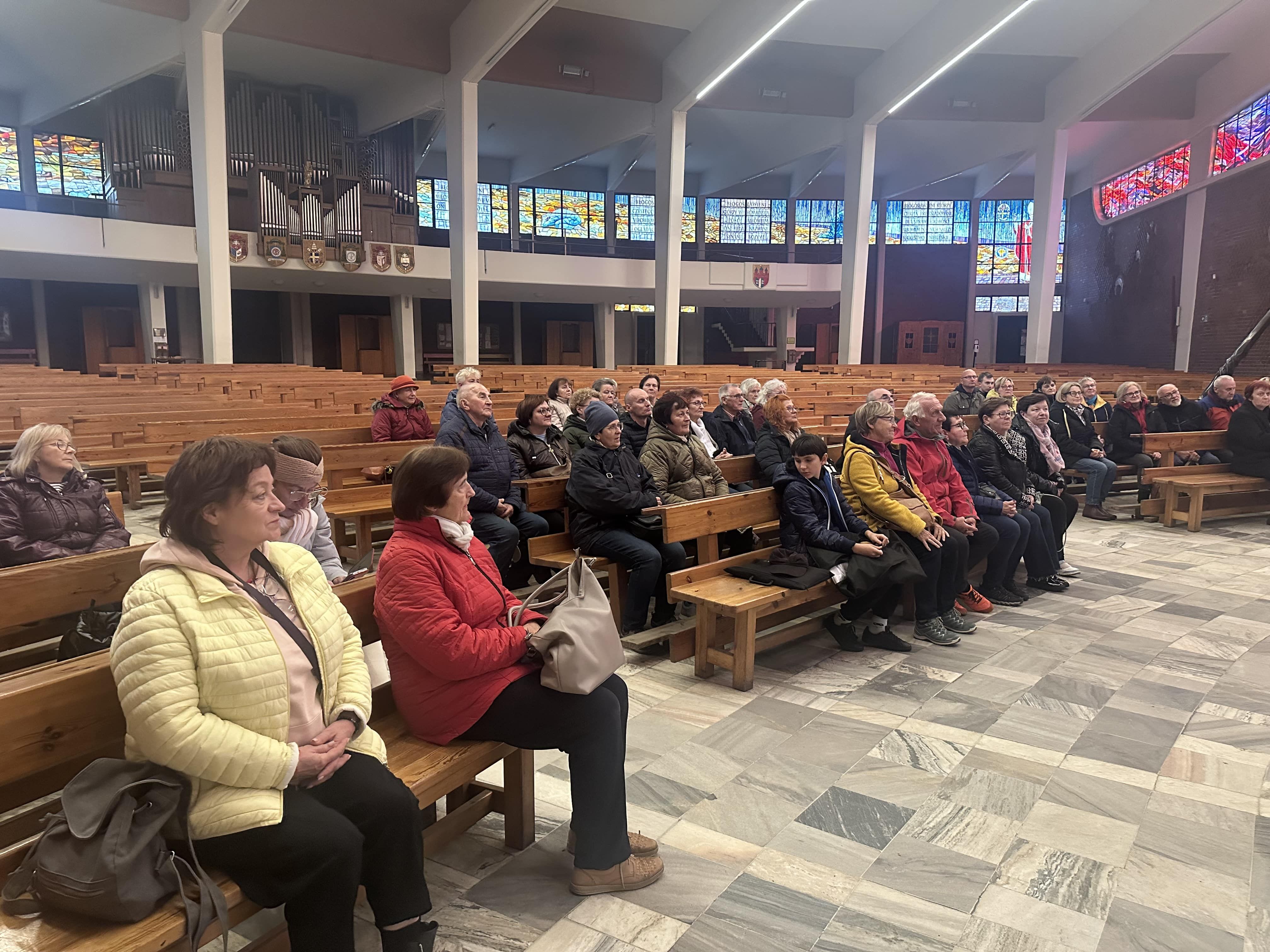 • Sanktuarium Najświętszej Maryi Panny Gwiazdy Nowej Ewangelizacji w Toruniu, gdzie przyjechaliśmy przed 15.00 i uczestniczyliśmy w Koronce do Miłosierdzia Bożego. Potem każdy indywidualnie mógł zwiedzić i podziwiać piękno tej świątyni konsekrowanej w 2016 r. Na dolnym poziomie jest Kaplica Pamięci z witrażami przedstawiającymi sceny z życia Jana Pawła II. W górnym kościele znajduje się prezbiterium będące repliką prywatnej kaplicy Jana Pawła II w Watykanie. Umieszczono tam naturalnej wielkości figurę modlącego się Papieża.