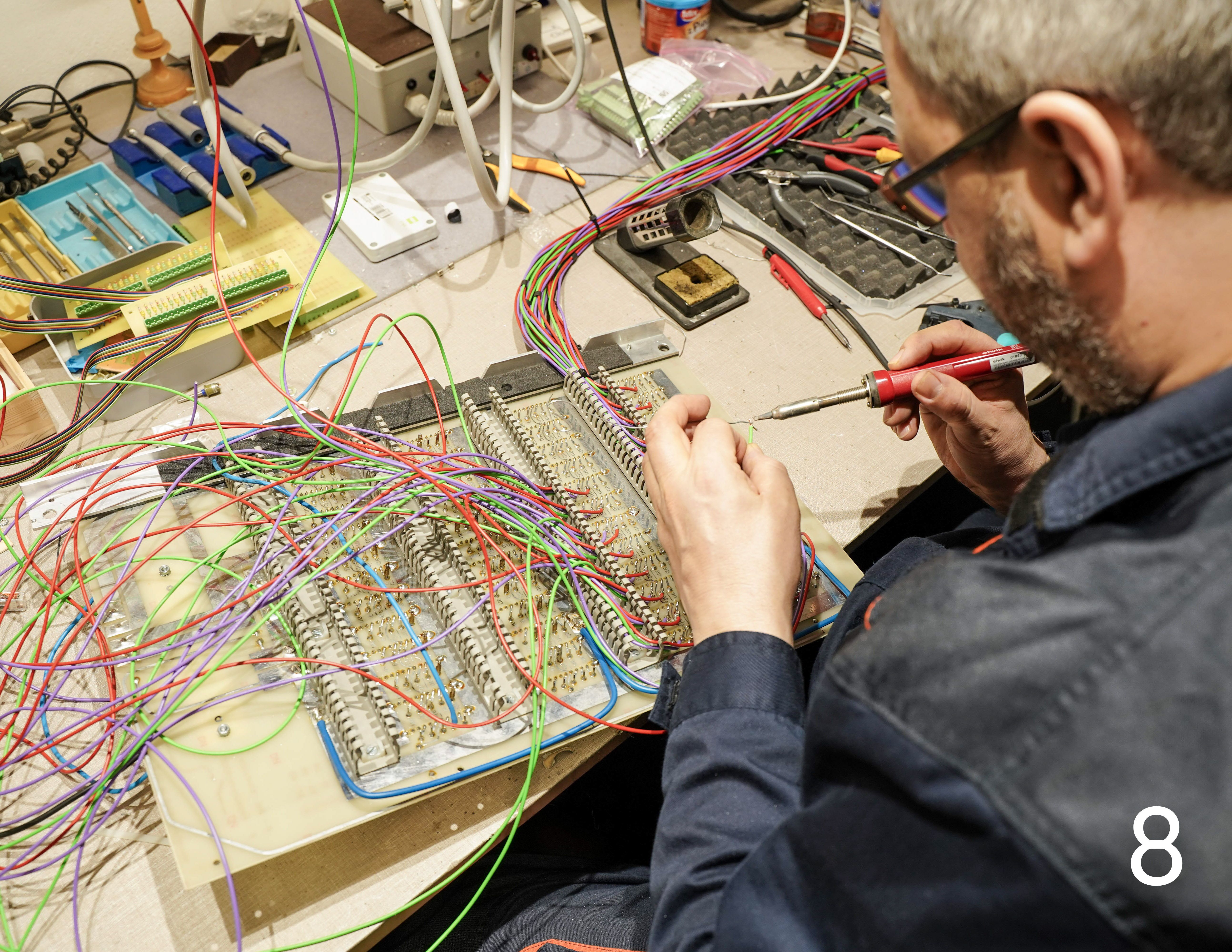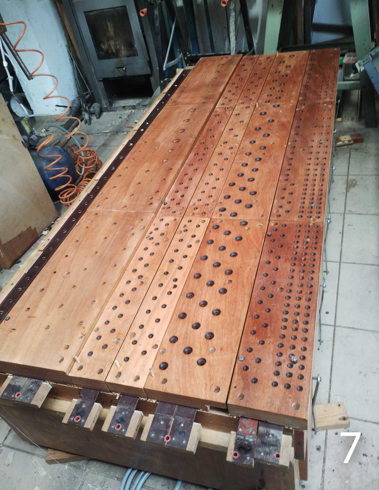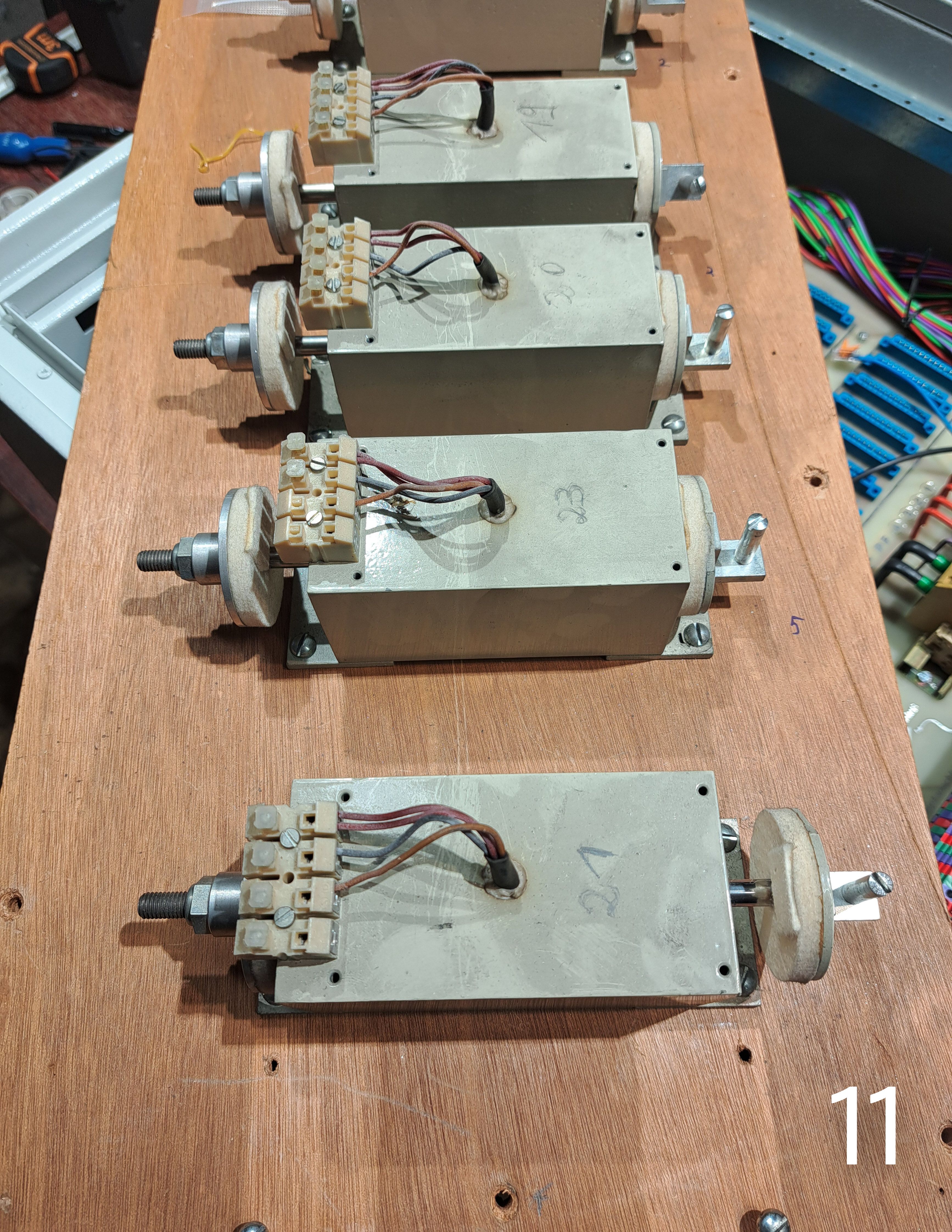 4. W moim warsztacie w klasztorze w Panewnikach trwają prace nad przebudową elektronicznego systemu sterowania elektromagnesów rejestrowych. Są to duże magnesy, które w momencie załączenia przez organistę wybranego głosu przesuwają specjalne zasuwy, umożliwiające dopływ powietrza do poszczególnych piszczałek (zdjęcie nr 11). Oryginalnie elektromagnesy były podłączone do tego urządzenia za pomocą metalowych wsuwek, które niestety z czasem traciły przewodność i były powodem niewłaściwej pracy. Owe połączenia zostały zastąpione bardziej niezawodnymi złączkami śrubowymi, co powinno zagwarantować bezawaryjną pracę (zdjęcia nr 8-10).