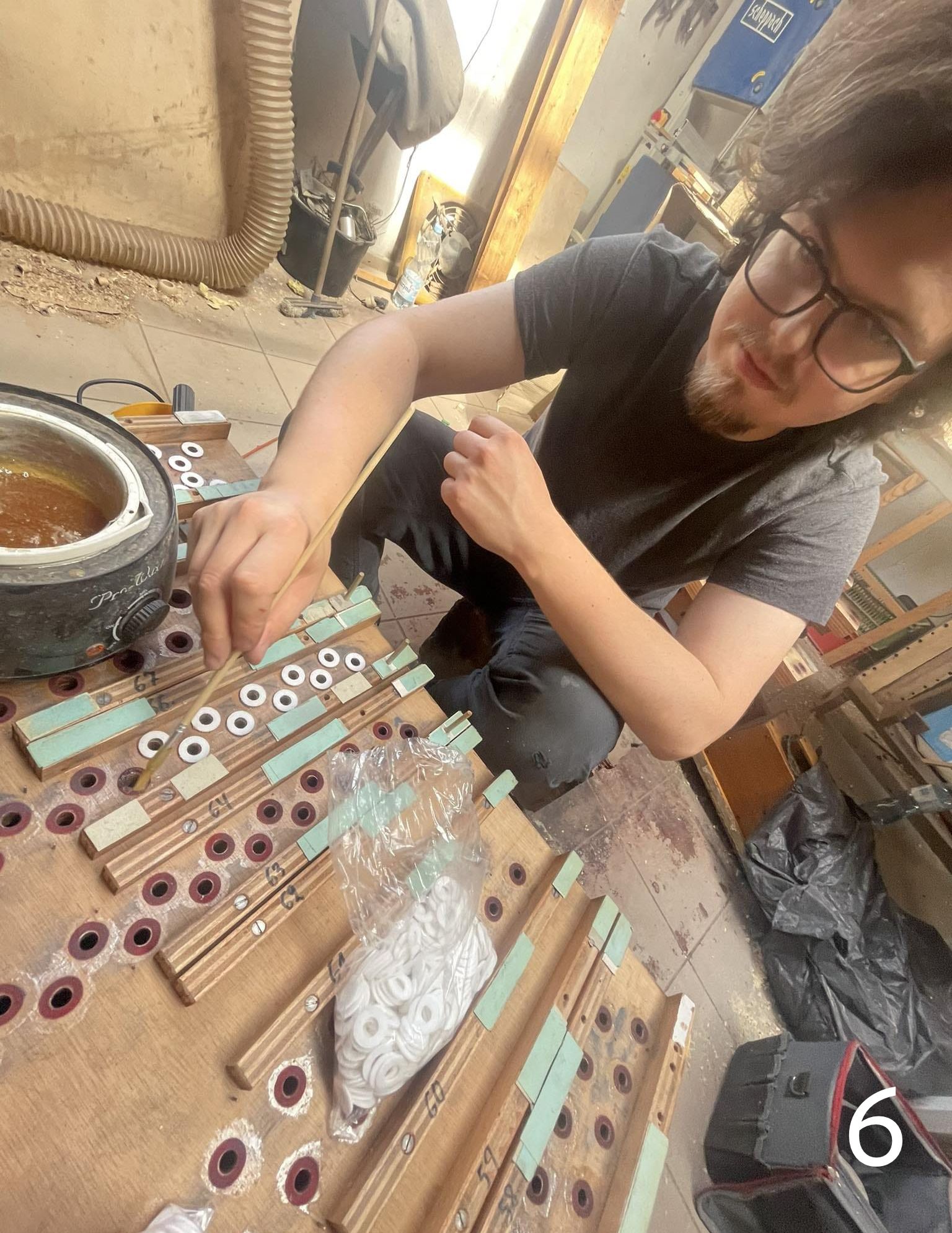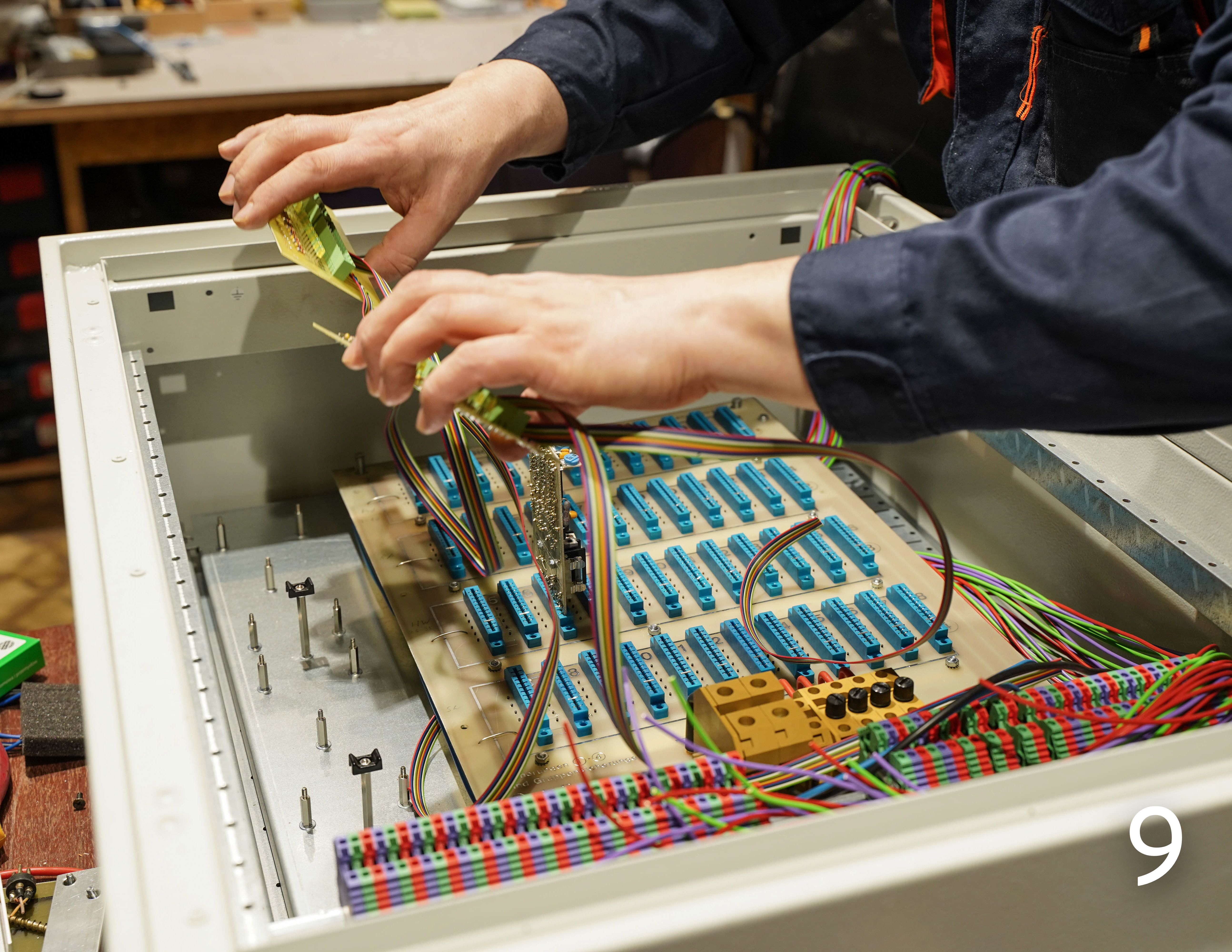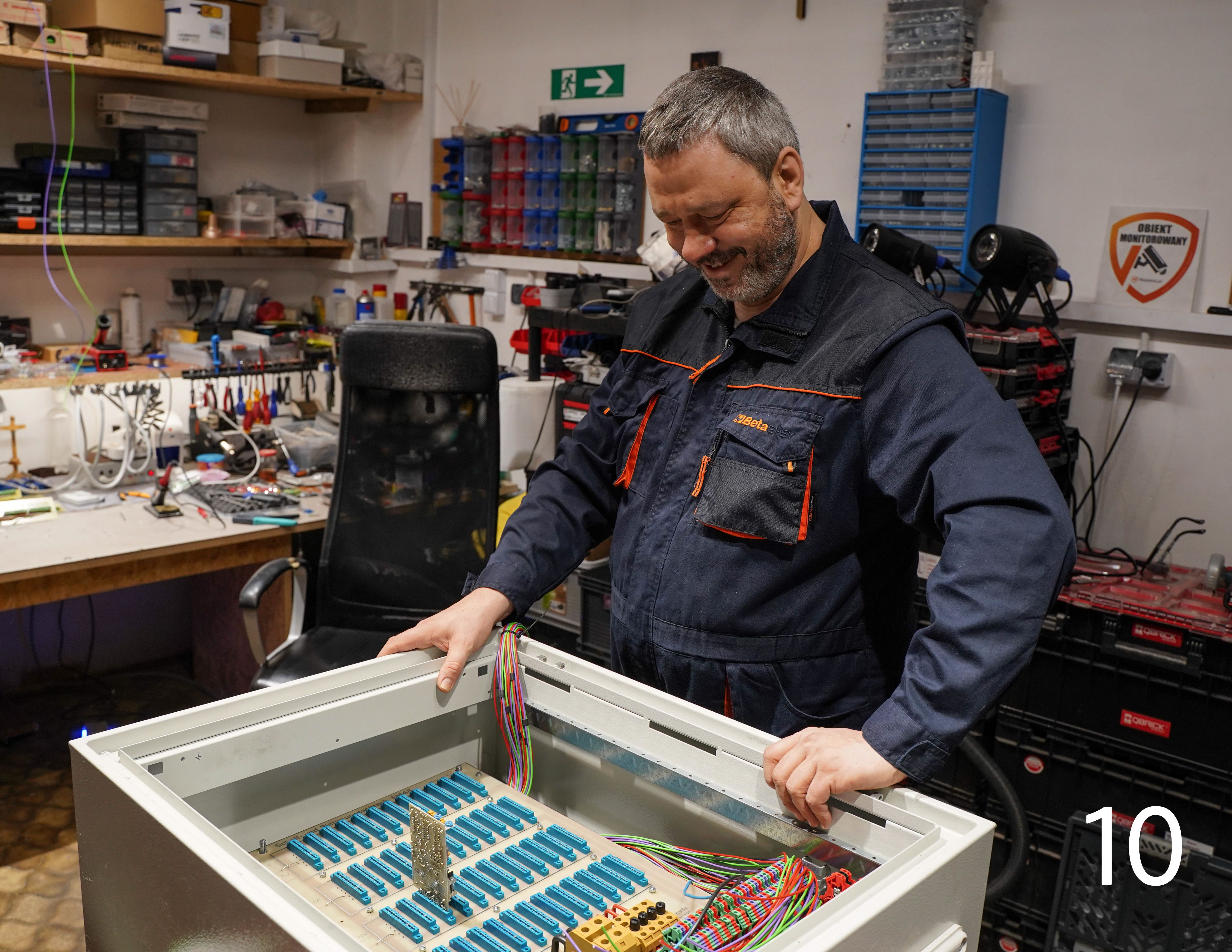 4. W moim warsztacie w klasztorze w Panewnikach trwają prace nad przebudową elektronicznego systemu sterowania elektromagnesów rejestrowych. Są to duże magnesy, które w momencie załączenia przez organistę wybranego głosu przesuwają specjalne zasuwy, umożliwiające dopływ powietrza do poszczególnych piszczałek (zdjęcie nr 11). Oryginalnie elektromagnesy były podłączone do tego urządzenia za pomocą metalowych wsuwek, które niestety z czasem traciły przewodność i były powodem niewłaściwej pracy. Owe połączenia zostały zastąpione bardziej niezawodnymi złączkami śrubowymi, co powinno zagwarantować bezawaryjną pracę (zdjęcia nr 8-10).