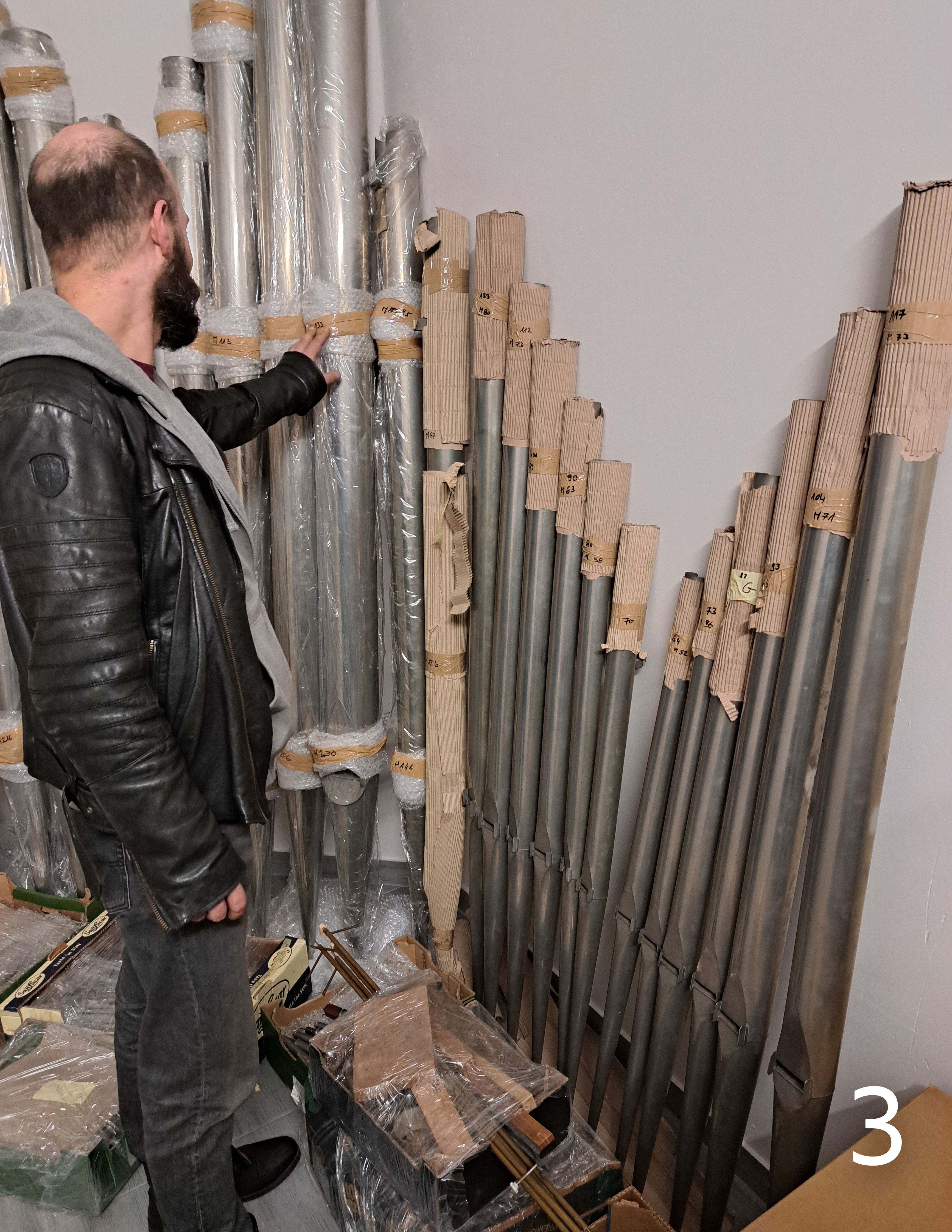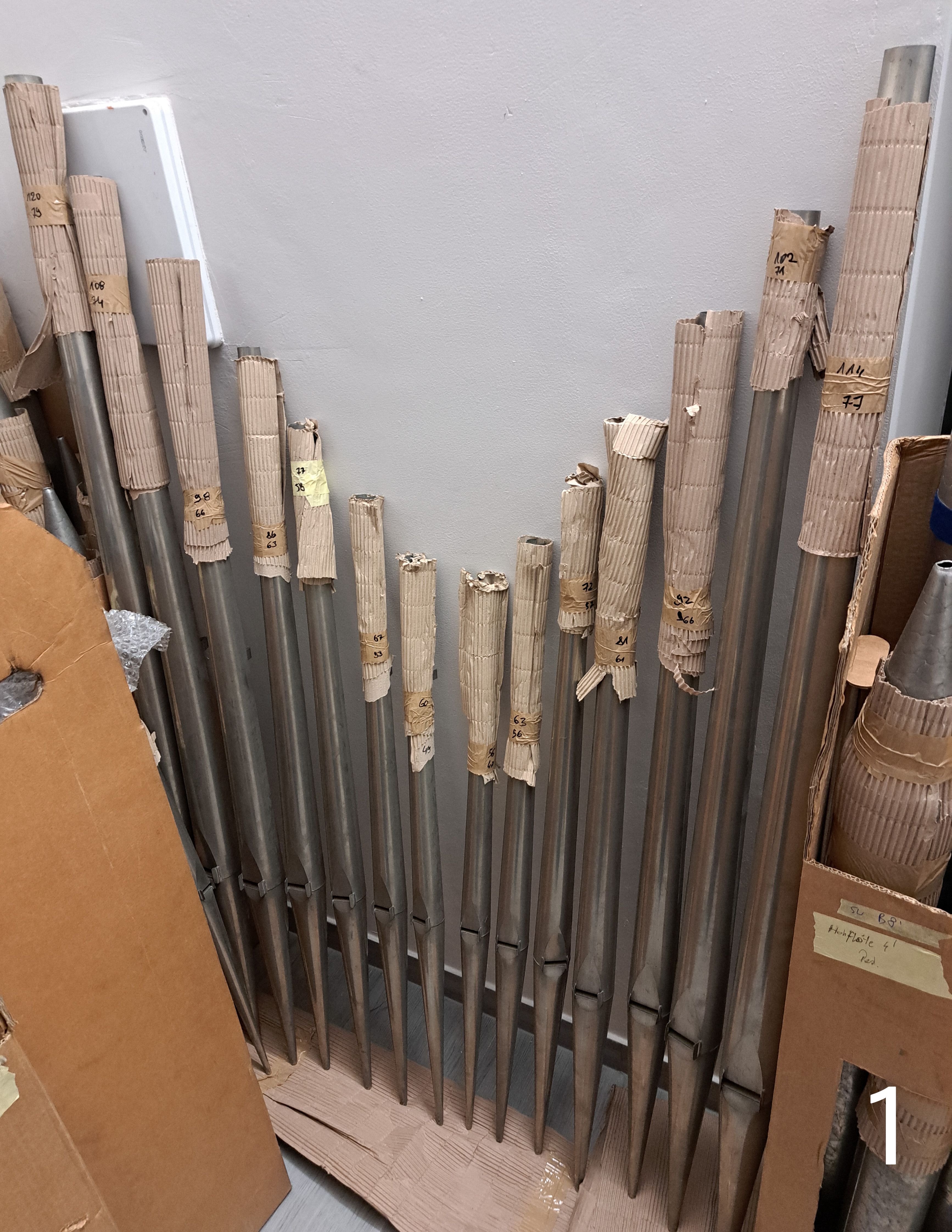 1. W kwietniu miała miejsce inwentaryzacja piszczałek prospektowych, czyli tych, które będzie widać, aby możliwe było stworzenie projektu i symulacji tego, jak z zewnątrz organy będą wyglądać (zdjęcia nr 1-3).