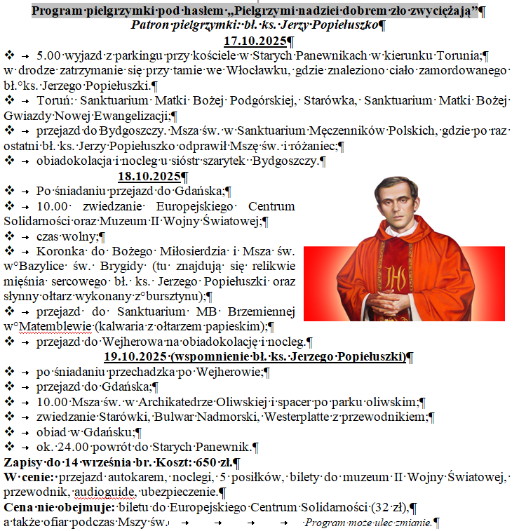 Program pielgrzymki pod hasłem „Pielgrzymi nadziei dobrem zło zwyciężają”